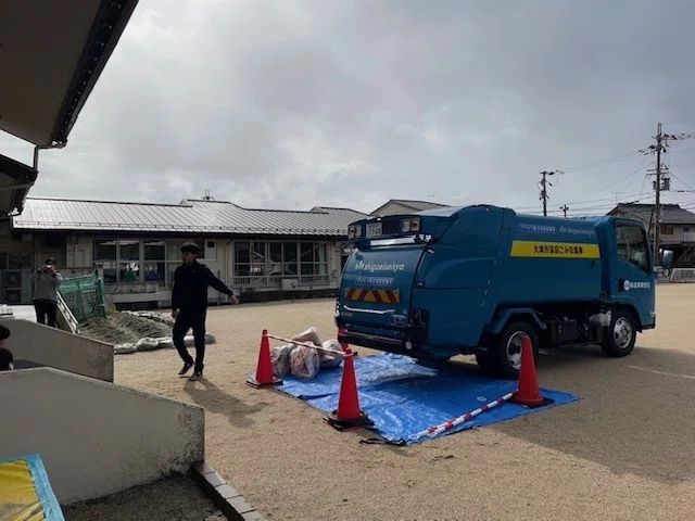 園庭にパッカー車(ごみ収集車)を準備し、ラッピングされた子どもたちの絵や、テールゲートをダンプする様子を屋根のある屋内からとても興味深く見学してくれました。