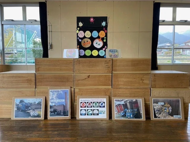 後半はホールに場所を移して年中・年長クラスを対象に、収集後のごみが運ばれていく流れや、分別方法、リサイクルの話を写真付きのボードを使いながら説明をしました。