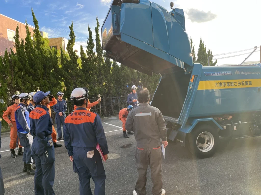大津市消防局さん、株式会社大津衛生社さん、塵芥車(パッカー車)の仮装メーカーとの合同訓練に参加しました。